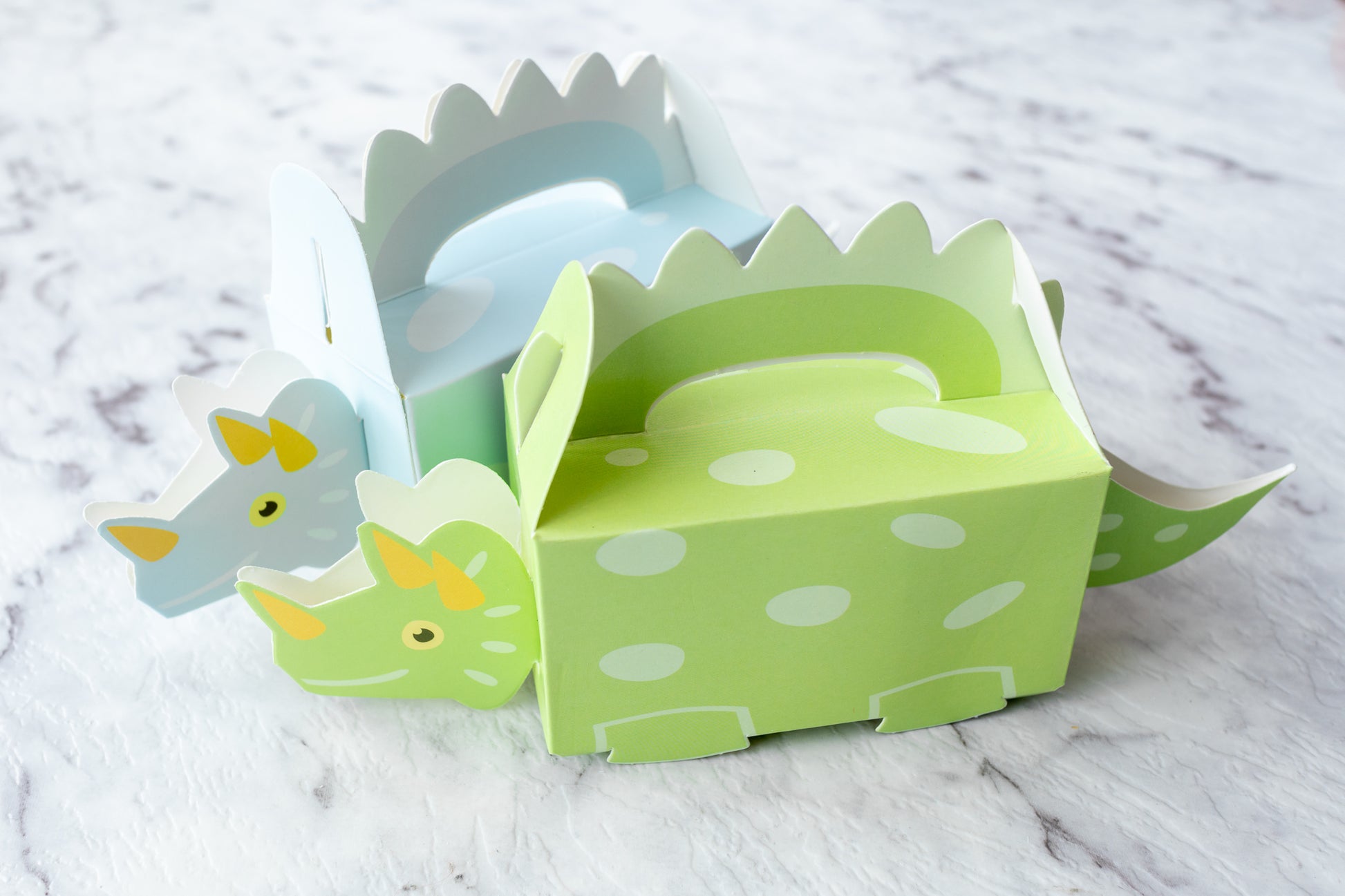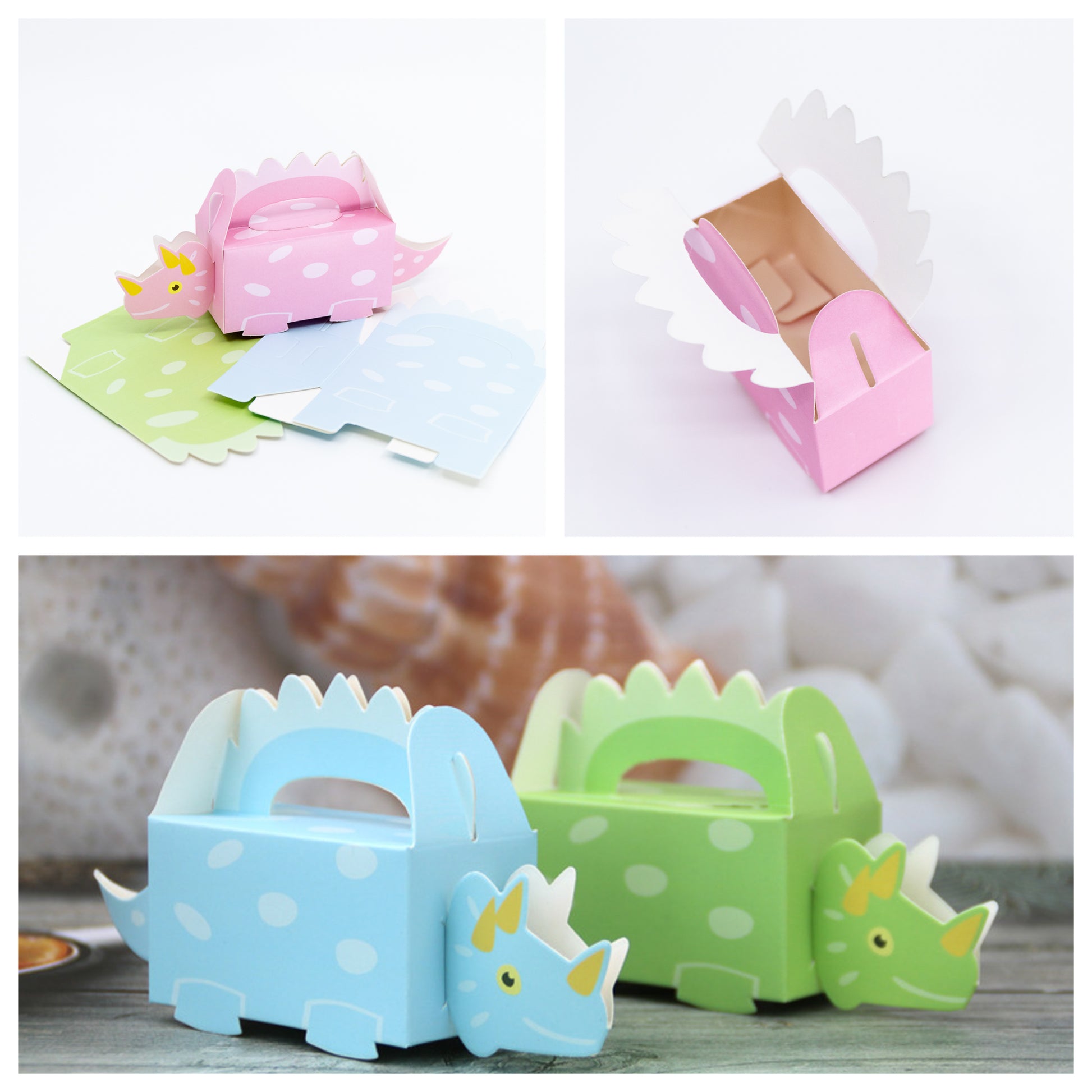 Celebrate in style with our Dino-themed party favour gift boxes. Designed in green and blue, these boxes are perfect for kids' birthday parties and baby showers. Fill them with treats and gifts for your guests and friends to enjoy. Make your event extra special with these adorable and fun favour boxes.